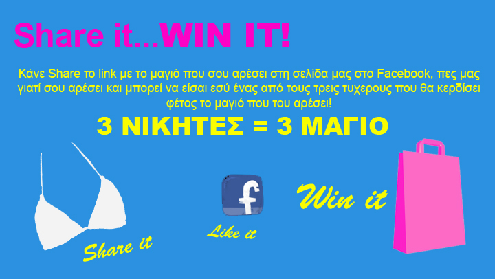 Share it…Win It!  Κάνε share το link με το μαγιό που σου αρέσει, πες μας γιατί σου αρέσει και μπορεί να είσαι εσύ ένας από τους τρεις τυχερους που θα κερδίσει φέτος το μαγιό που του αρέσει!