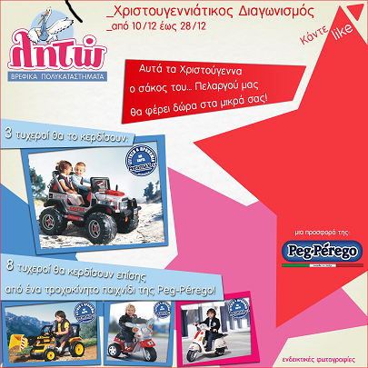 Τα Βρεφικά Πολυκαταστήματα Λητώ διοργανώνουν διαγωνισμό και σας δίνουν τη δυνατότητα να κερδίσετε 11 τροχοκίνητα παιχνίδια από την Peg-Perego.