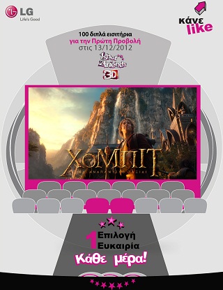 H LG παρουσιάζει τον διαγωνισμό «1 Shot, 2 Friends, 3D» και σου δίνει κάθε ημέρα μια ευκαιρία να κερδίσεις ένα από τα 100 διπλά εισιτήρια για τη νέα ταινία της Village Cinemas «The Hobbit» 3D!