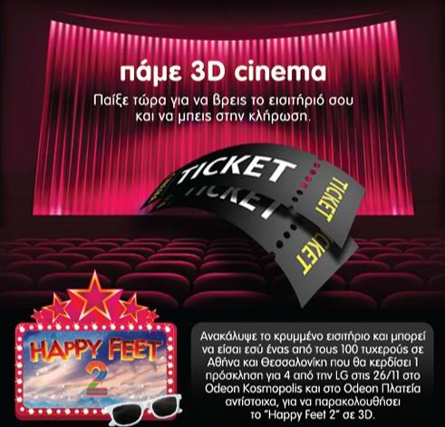 Η LG Hellas διοργανώνει διαγωνισμό στο facebook και δίνει τη δυνατότητα σε 50 τυχερούς από Αθήνα & 50 από Θεσσαλονίκη να κερδίσουν από μια πρόσκληση για 4 άτομα, για να παρακολουθήσουν το Happy Feet 2 σε 3D.