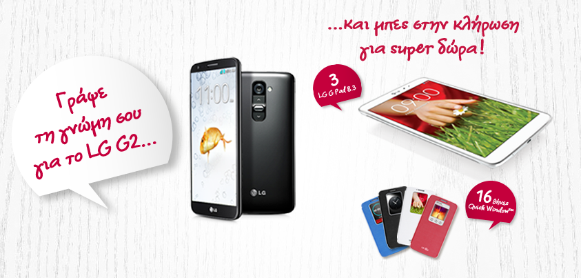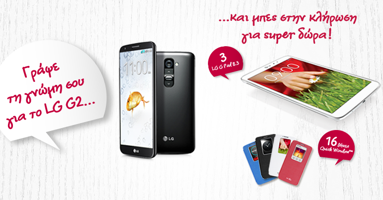 Το lg.com διοργανώνει διαγωνισμό και σας δίνει τη δυνατότητα να κερδίσετε 3 LG G PAD και 16 θήκες LG G2 Quick Window™!