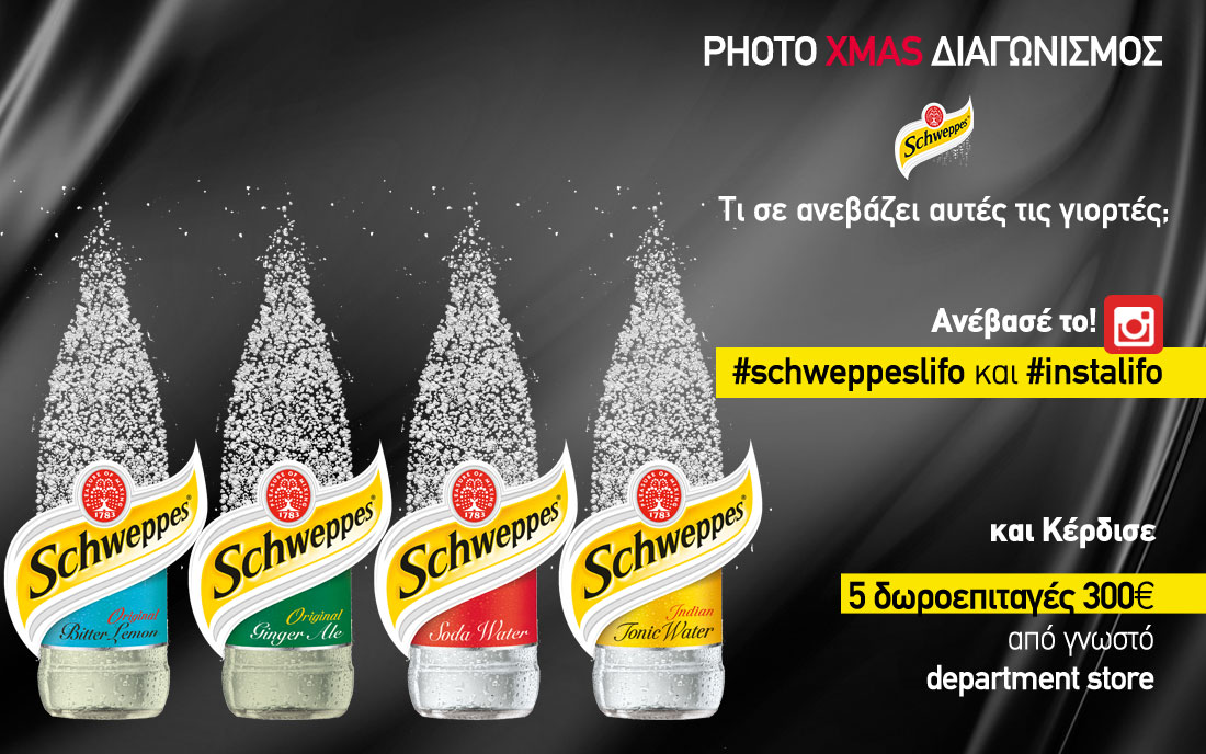 Τι σε ανεβάζει αυτές τις γιορτές; Photo Xmas Διαγωνισμός από τη Schweppes και τη LiFO. Έως και τις 7 Ιανουαρίου, ανέβασε τη φωτογραφία σου στο Instagram με hashtags #schweppeslifo & #instalifo και θα μπεις αυτόματα στην κλήρωση για μια από τις 5 δωροεπιταγές αξίας 300€ από γνωστό department store.