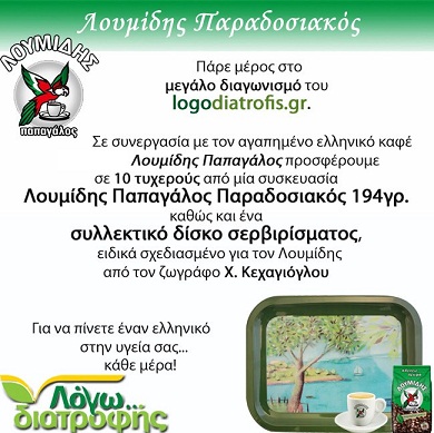 Η σελίδα logodiatrofis.gr διοργανώνει διαγωνισμό και σας δίνει τη δυνατότητα να κερδίσετε 1 συσκευασία Λουμίδης Παπαγάλος Παραδοσιακός 194γρ και ένα συλλεκτικό δίσκο σερβιρίσματος, ειδικά σχεδιασμένο για τον Λουμίδη από τον ζωγράφο Χ.Κεχαγιόγλου, που θα δοθούν σε δέκα τυχερούς.
