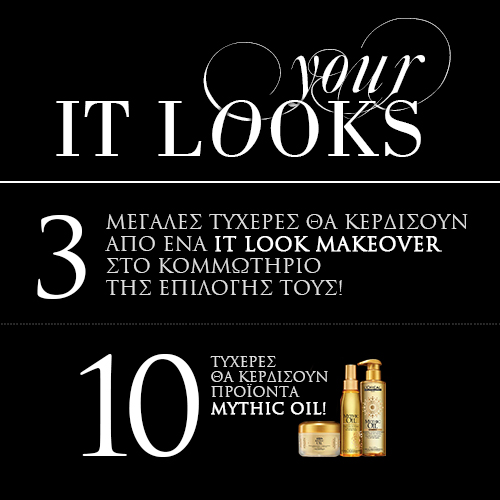 H σελίδα L’Oreal Professionnel Greece διοργανώνει διαγωνισμό και χαρίζει στους 3 πρώτους τυχερούς από μία περιποίηση μαλλιών (βαφή, κούρεμα και χτένισμα) και στους υπόλοιπους 20 από ένα σετ περιποίησης μαλλιών «Mythic Oil» (σαμπουάν, μάσκα μαλλιών και λάδι περιποίησης μαλλιών).