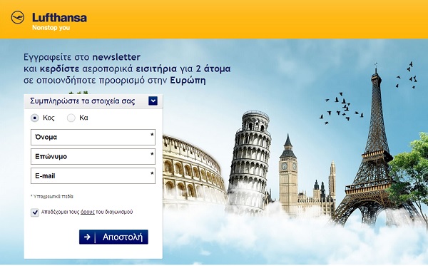 H Lufthansa διοργανώνει διαγωνισμό και δίνει τη δυνατότητα σε 2 τυχερούς να κερδίσουν αεροπορικά εισιτήρια για 2 άτομα σε οποιονδήποτε προορισμό στην Ευρώπη!