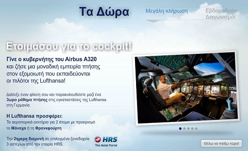 Η Lufthansa διοργανώνει διαγωνισμό και σας δίνει τη δυνατότητα να κερδίσετε ένα αεροπορικό ταξίδι στην Φρανκφούρτη ή στο Μόναχο για 2 άτομα, με δύο μέρες διαμονή. Στη μία από τις παραπάνω πόλεις που θα επιλέξει ο Νικητής, θα παρακολουθήσει ένα 3ώρο μάθημα στον εξομοιωτή πτήσης στις αντίστοιχες εγκαταστάσεις της Lufthansa. Επιπλέον κάθε εβδομάδα, 3 νικητές κερδίζουν από μια ψηφιακή κορνίζα της Lufthansa με ένδειξη ημερομηνίας, ημερολόγιο και λειτουργία αφύπνισης.