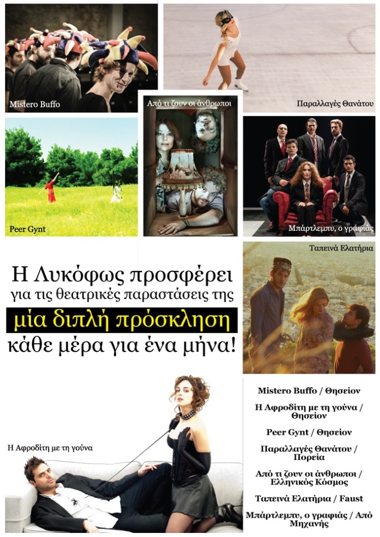Το lykofos.org διοργανώνει διαγωνισμό και σας δίνει τη δυνατότητα να κερδίσετε μία διπλή πρόσκληση κάθε ημέρα για Θεατρική Παράσταση αξίας 30 ευρώ!