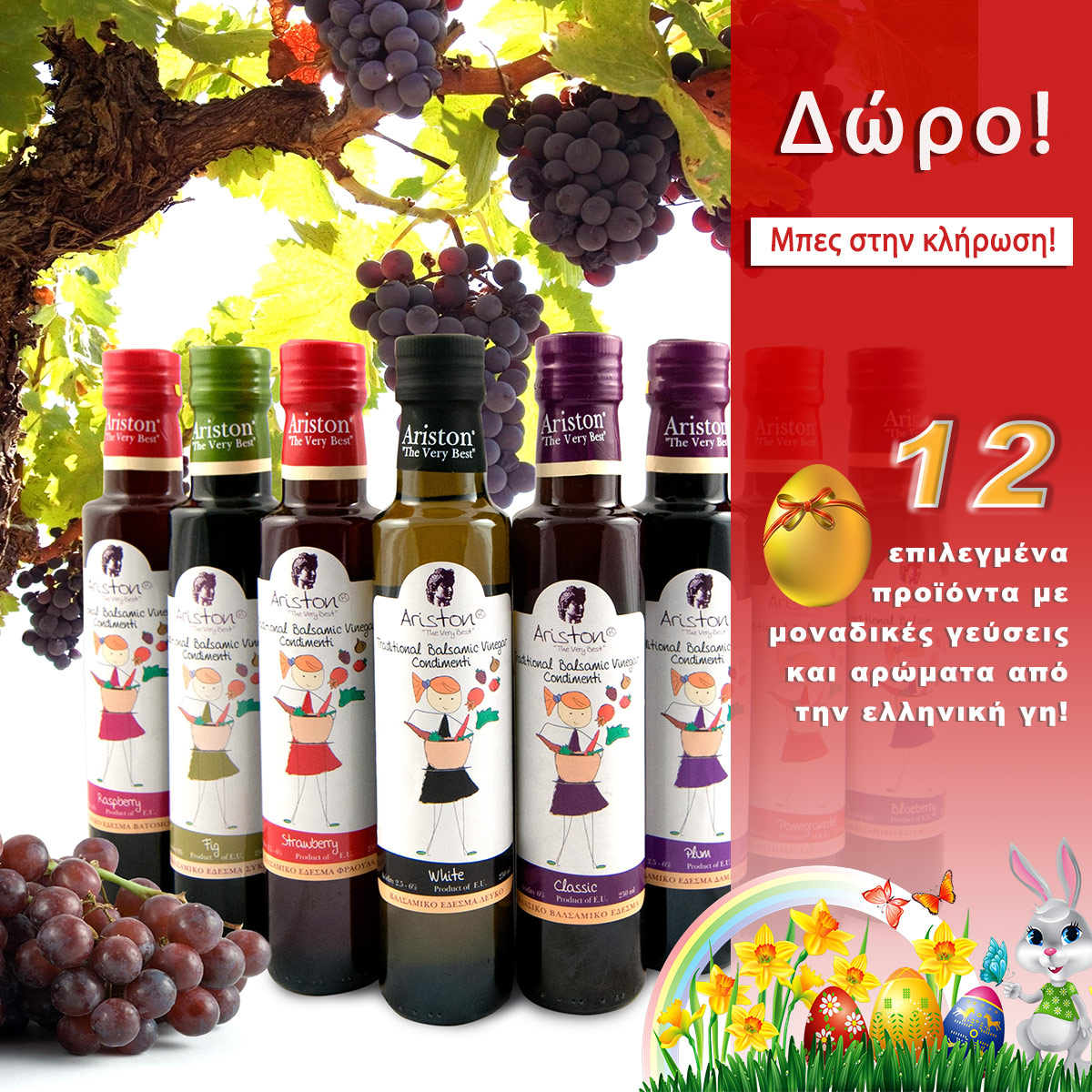 Βαλσαμικά:1 βιολογικό με γεύση σύκου, 3 με γεύση ρόδι, βατόμουρο και cranberry.