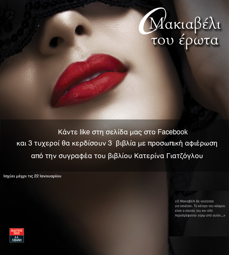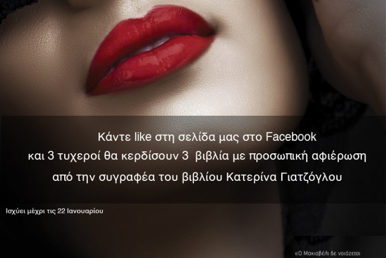 Η Μακιαβέλι του Έρωτα Facebook Page διοργανώνει διαγωνισμό και σας δίνει τη δυνατότητα να κερδίσετε 3 αντίτυπα του βιβλίου υπογεγραμμένα από τη συγγραφέα του βιβλίου Κατερίνα Γιατζόγλου!