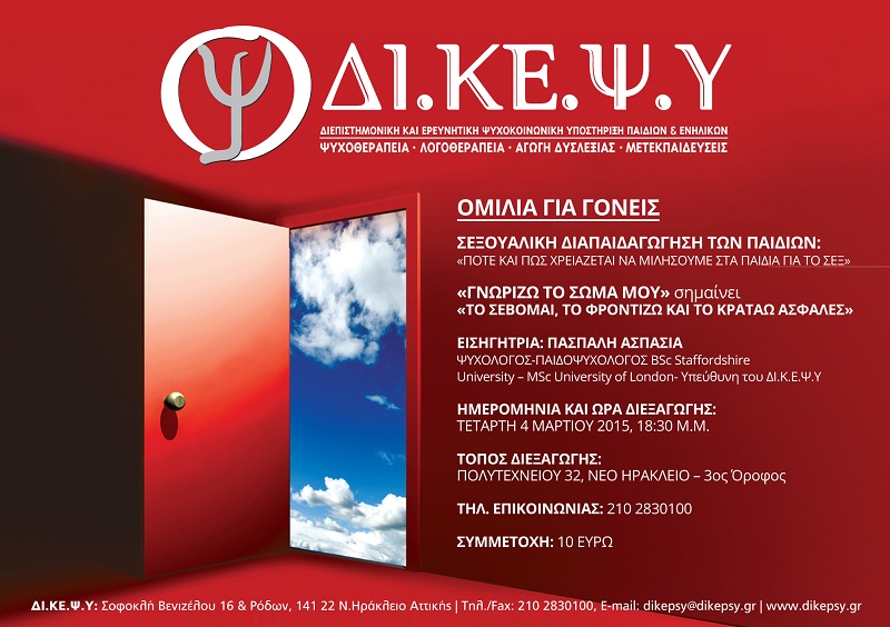 Το mamakid.gr διοργανώνει διαγωνισμό και σας δίνει τη δυνατότητα να κερδίσετε 1 δωρεάν συμμετοχή στην ομιλία για γονείς με θέμα «Σεξουαλική Διαπαιδαγώγηση των παιδιών. Πότε και πως χρειάζεται να μιλήσουμε στα παιδιά για το σεξ;» που διοργανώνει το Κέντρο ΔΙ.Κ.Ε.Ψ.Υ την Τετάρτη 4 Μαρτίου 2015!