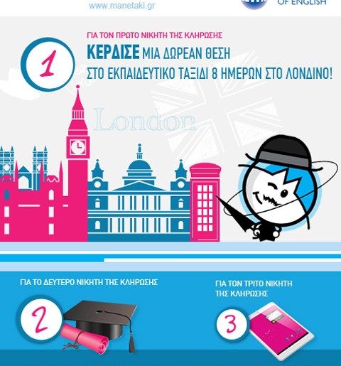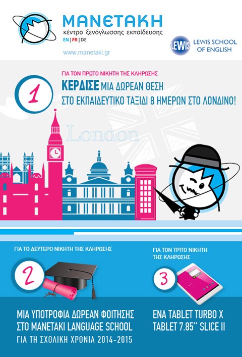 Το Κέντρο Ξενόγλωσσης Εκπαίδευσης Μανετάκη διοργανώνει διαγωνισμό και σας δίνει τη δυνατότητα να κερδίσετε ένα εκπαιδευτικό ταξίδι 8 ημερών στο Λονδίνο, μία υποτροφία δωρεάν φοίτησης στο Φροντιστήριο Μανετάκη και ένα Tablet Turbo X!
