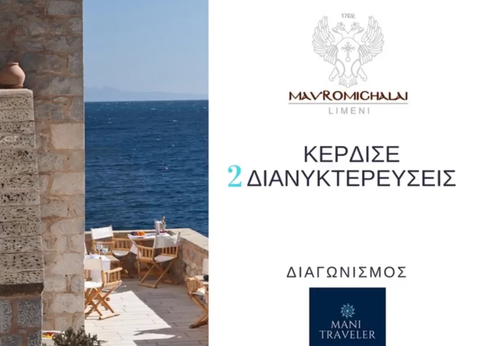Το Mani Traveler διοργανώνει διαγωνισμό και σας δίνει τη δυνατότητα να κερδίσετε 2 διανυκτερεύσεις για έως και 2 άτομα σε standard δίκλινο δωμάτιο με θέα θάλασσα και πλούσιο, παραδοσιακό πρωινό με τοπικά προϊόντα, αξίας 300€, σε ένα από τα ωραιότερα boutique καταλύματα στην Ελλάδα, το Μαυρομιχάλαι!