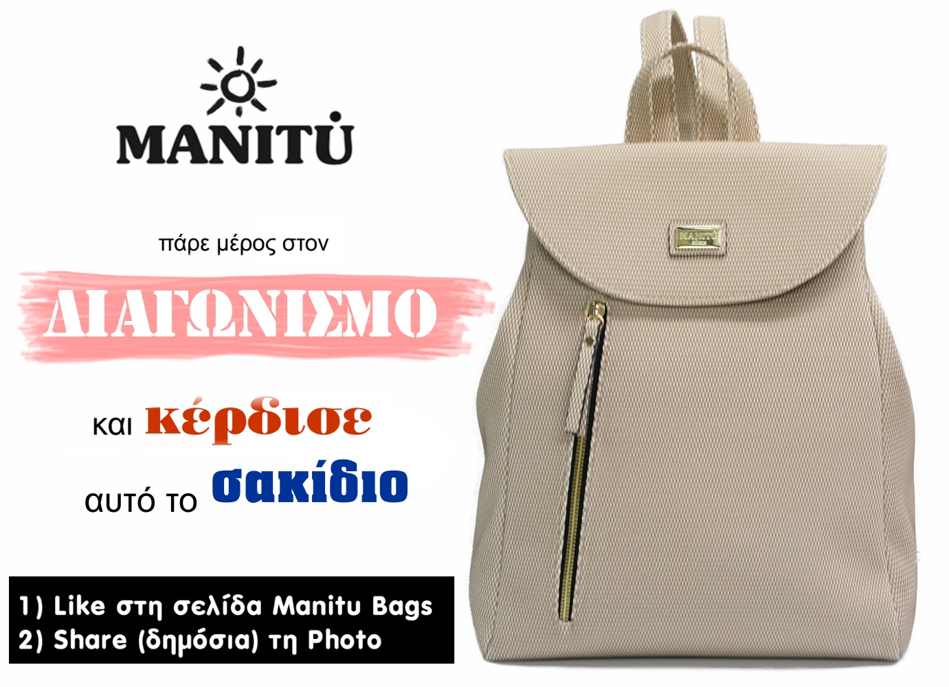 H Manitu bags διοργανώνει διαγωνισμό και σας δίνει τη δυνατότητα να κερδίσετε ένα υπέροχο backpack σε χρώμα που ταιριάζει με τα πάντα!