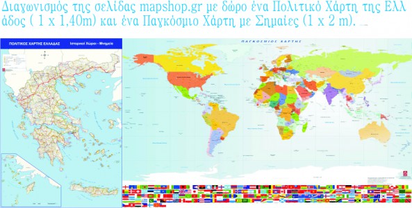 Η εταιρεία mapshop cartografia διοργανώνει τον πρώτο της διαγωνισμό και χαρίζει σε 2 τυχερούς από έναν χάρτη ! Έναν Πολιτικό Χάρτη Ελλάδος (1 x 1,40m) και έναν Παγκόσμιο Χάρτη με Σημαίες (1 x 2m).