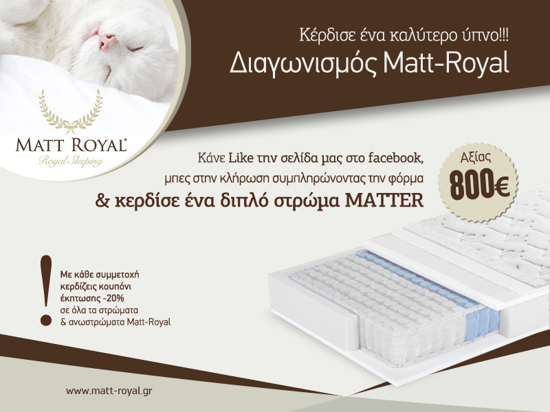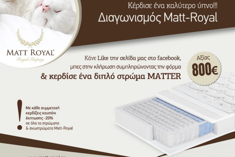 Η σελίδα Matt Royal διοργανώνει διαγωνισμό και σας δίνει τη δυνατότητα να κερδίσετε ένα διπλό στρώμα MATTER αξίας 800 ευρώ!