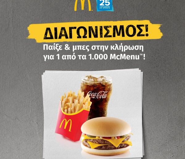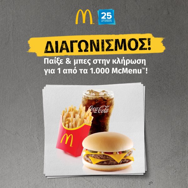 Tα McDonald’s διοργανώνουν διαγωνισμό και δίνουν τη δυνατότητα σε 1000 τυχερούς να κερδίσουν από ένα McMenu αποτελούμενο από Chicken McNuggets ή Big Mac ή McChicken ή McChicken Crispy Bacon ή Quarter Pounder με τυρί ή Double Cheeseburger μαζί με μία μερίδα τηγανητές πατάτες και αναψυκτικό 400ml!