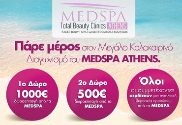 Το Med Spa Athens διοργανώνει διαγωνισμό στο facebook και δίνει τη δυνατότητα σε ένα μεγάλο τυχερό να κερδίσει υπηρεσίες αξίας 1000€, επιλέγοντας μέσα από μια ολοκληρωμένη γκάμα υψηλής ποιότητας θεραπειών για το πρόσωπο και το σώμα. Ο δεύτερος νικητής, αντίστοιχα θα κερδίσει υπηρεσίες αξίας 500€, ενώ όλοι οι συμμετέχοντες στο διαγωνισμό θα κερδίσουν από μία δωρεάν θεραπεία αντιηλιακής προστασίας για το πρόσωπο.