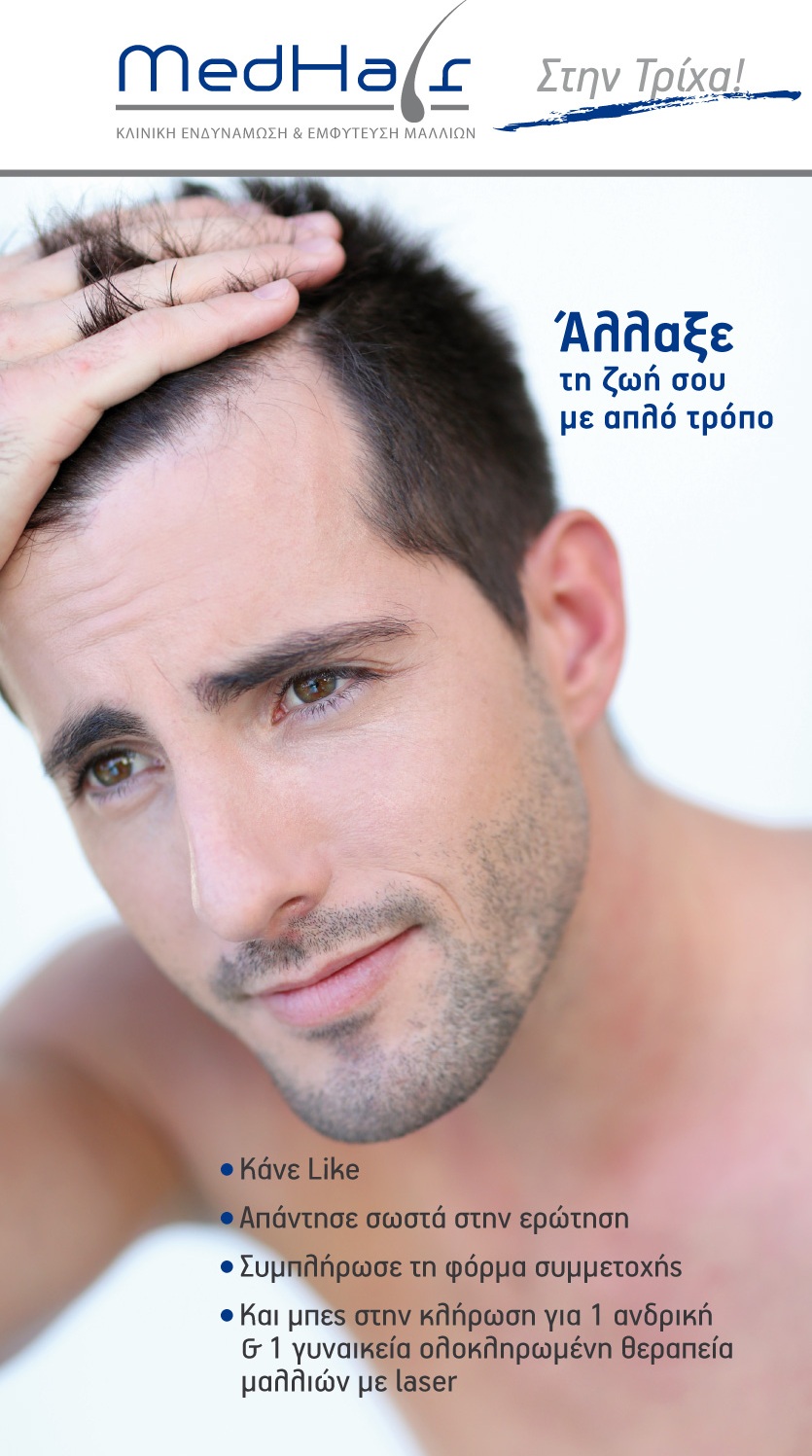 Το MedHair διοργανώνει διαγωνισμό και σας δίνει τη δυνατότητα να κερδίσετε 1 ανδρική και 1 γυναικεία ολοκληρωμένη θεραπεία μαλλιών με laser .