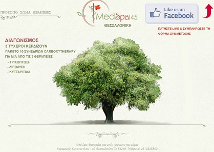 Το MedSpa 145 στη Θεσσαλονίκη διοργανώνει διαγωνισμό και σας δίνει τη δυνατότητα να κερδίσετε 3 πακέτα θεραπειών Carboxytherapy (10 συνεδρίες) για λιπόλυση ή τριχόπτωση ή κυτταρίτιδα.