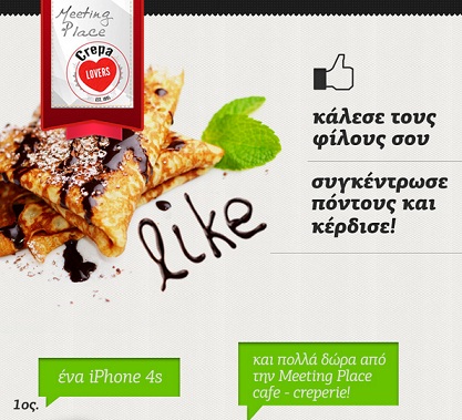 Η σελίδα Meeting Place Crepa Lovers διοργανώνει διαγωνισμό και σας δίνει τη δυνατότητα να κερδίσετε ένα iPhone 4S, γεύματα για 2 άτομα και πολλές κρέπες.