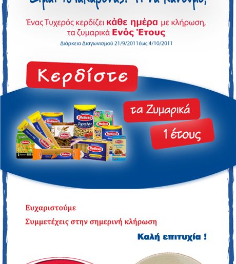 Η Melissa διοργανώνει διαγωνισμό και δίνει τη δυνατότητα σε (ένα) νικητή κάθε μέρα να κερδίσει Ζυμαρικά Μέλισσα για 1 έτος, που σημαίνει ότι παραλαμβάνει ένα πακέτο με ζυμαρικά βάρους 10 κιλών, ποσότητα που είναι μεγαλύτερη από τη μέση ατομική ετήσια κατανάλωση, όπως αυτή προκύπτει από σχετική έρευνα.