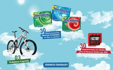 Η σελίδα Mentos Greece διοργανώνει διαγωνισμό και σας δίνει τη δυνατότητα να κερδίσετε κάθε εβδομάδα 1 ποδήλατο μάρκας Capriolo, 10 δωροεπιταγές αξίας 30€ από τα Factory Outlet και 10 πολυσυσκευασίες mentos storming με όλες τις γεύσεις.
