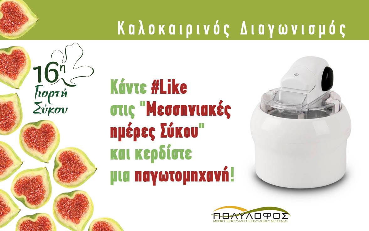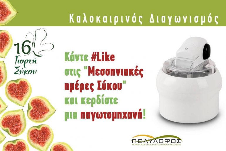 Οι Μεσσηνιακές Ημέρες Σύκου διοργανώνουν διαγωνισμό και σας δίνουν τη δυνατότητα να κερδίσετε μία παγωτομηχανή! Κάντε LIKE στη σελίδα Μεσσηνιακές Ημέρες Σύκου και SHARE τη φωτογραφία του διαγωνισμού και κερδίστε μία παγωτομηχανή!