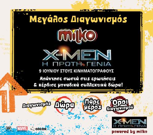 Μπες τώρα στη fan page του milko στο facebook και πάρε μέρος στο milko X-MEN! Απάντησε σωστά τις 3 ερωτήσεις και κέρδισε συλλεκτικά ρολόγια, usb pens και jacket της ταινίας .