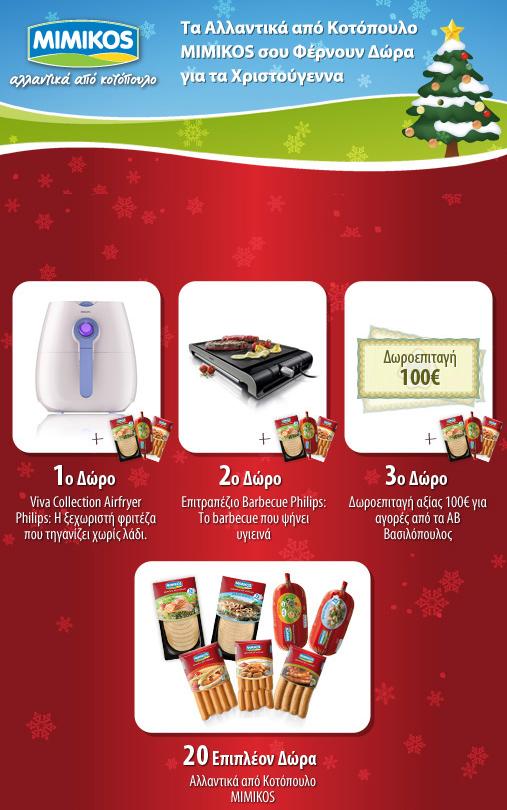- 20 τυχεροί θα κερδίσουν αλλαντικά από κοτόπουλο MIMIKOS (1 συσκευασία Παριζάκι από Κοτόπουλο MIMIKOS 340g, 1 συσκευασία Λουκάνικα από Κοτόπουλο ΜΙΜΙΚΟS 285g, 1 συσκευασία Φιλέτο Βραστό ΜΙΜΙΚΟS 350g, 1 συσκευασία Λουκάνικα Cocktail από Κοτόπουλο ΜΙΜΙΚΟS 250g, 1 συσκευασία Χωριάτικα Λουκάνικα από Κοτόπουλο με Πράσο MIMIKOS 400g, 1 συσκευασία Καπνιστό Φιλέτο Κοτόπουλο (σε φέτες) MIMIKOS 120g, 1 συσκευασία Βραστό Φιλέτο Κοτόπουλο (σε φέτες) MIMIKOS 120g.)