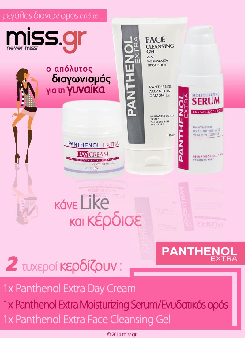 Το miss.gr διοργανώνει διαγωνισμό και σας δίνει τη δυνατότητα να κερδίσετε 2 πακέτο που περιλαμβάνουν: Panthenol Extra Day Cream, Panthenol Extra Moisturizing Serum/Ενυδατικός ορός, Panthenol Extra Face Cleansing Gel από την Medisei!