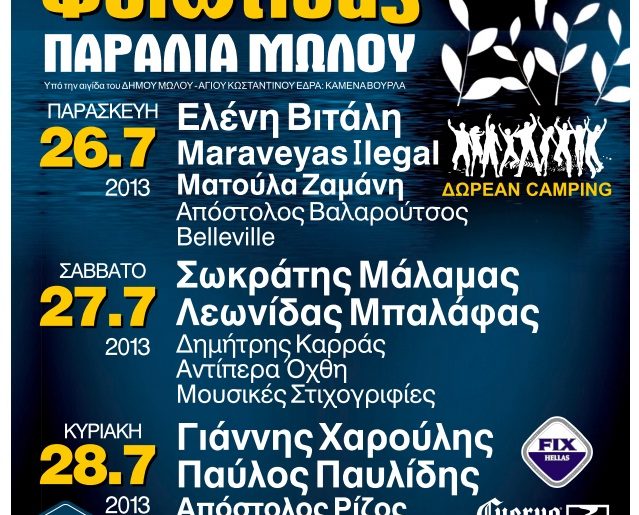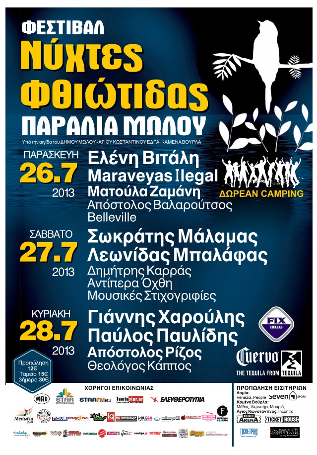 To Mixgrill.gr διοργανώνει διαγωνισμό και σας προσφέρει 3 τριήμερες διπλές προσκλήσεις για το Φεστιβάλ «Nύχτες Φθιώτιδας στην Παραλία Μώλου στη Φθιώτιδα την Παρασκευή 26, Σάββατο 27 και Κυριακή 28 Ιουλίου 2013!