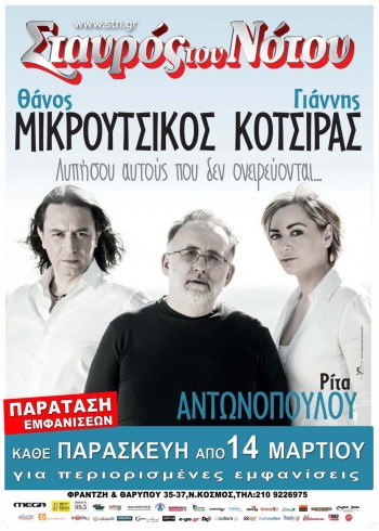 • 2 διπλές προσκλήσεις χωρίς ποτό για την εμφάνιση των Θ. Μικρούτσικου, Γ. Κότσιρα & Ρ. Αντωνοπούλου στην Κεντρική Σκηνή του Σταυρού του Νότου την Παρασκευή 28 Μαρτίου