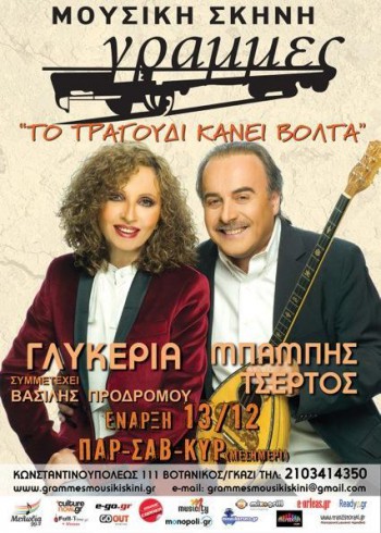 • 2 διπλές προσκλήσεις με μπύρα ή κρασί για την εμφάνιση της Γλυκερίας και του Μπάμπη Τσέρτου στις Γραμμές την Παρασκευή 10 Ιανουαρίου
