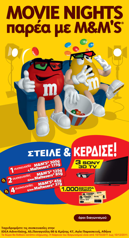 Τα M&M’s Greece διοργανώνουν διαγωνισμό στο facebook με δώρα 3 Sony 3D τηλεοράσεις και 1.000 εισιτήρια σινεμά.