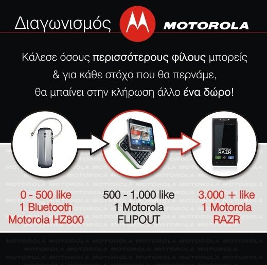 Η Motorola Hellas διοργανώνει διαγωνισμό στο Facebook για ένα bluetooth Motorola HZ800, ένα Motorola Flipout και ένα Motorola Razr.