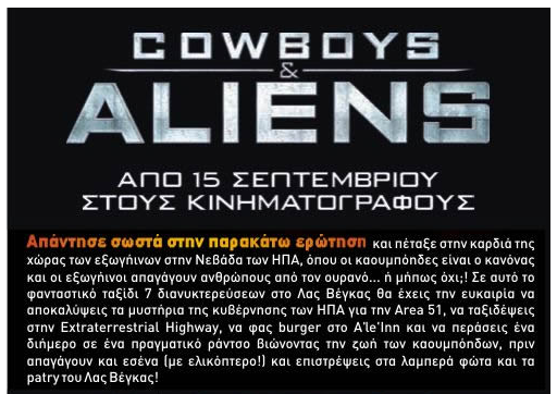 To MSN Greece διοργανώνει μεγάλο διαγωνισμό στο facebook με αφορμή την ταινία “Cowboys & Aliens” και σας δίνει τη δυνατότητα να κερδίσετε εντελώς δωρεάν ένα ταξίδι 7 ημερών στο Λας Βέγκας των ΗΠΑ!