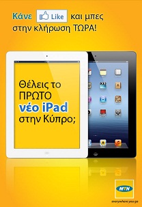 Η κυπριακή εταιρεία κινητής τηλεφωνίας MTN Cyprus προσφέρει στους φίλους της σελίδας της στο Facebook την ευκαιρία να κερδίσουν το ΠΡΩΤΟ ΝΕΟ iPad στην Κύπρο μέσω κλήρωσης.