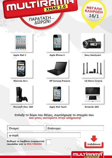 Το Multirama διοργανώνει διαγωνισμό και δίνει τη δυνατότητα σε 9 τυχερούς να κερδίσουν ipad2, iphone 4, sony handycam, Motorola Atrix, laptop HP, Home Cinema LG, Microsoft Xbox, ipod touch, Nintendo 3DS.