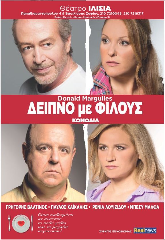 Τώρα το MustRadio σας προσφέρει 5 διπλές προσκλήσεις για την παράσταση” Δείπνο με φίλους ” του Αμερικανού πολυβραβευμένου θεατρικού συγγραφέα Ντόναλντ Μάργκιουλις, που παρουσιάζει στο θέατρο «Ιλίσια» ο Γρηγόρης Βαλτινός, μαζί με τον Παύλο Χαϊκάλη, τη Ρένια Λουιζίδου και την Μπέσυ Μάλφα την Τετάρτη 20 Νοεμβρίου 2013 στο ΘΕΑΤΡΟ ΙΛΙΣΙΑ στις 21:15.