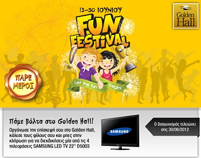 Το My Golden Hall διοργανώνει το διαγωνισμό “Πάμε Βόλτα στο Golden Hall” και σας δίνει τη δυνατότητα να κερδίσετε 4 τηλεοράσεις Samsung LED TV D5003.