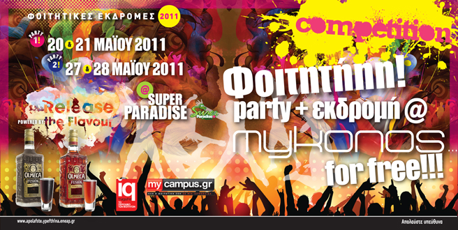1 φοιτητής με τον κολλητό ή την κολλητή του κερδίζει -χωρίς κλήρωση- ΔΩΡΕΑΝ την εκδρομή του στη Μύκονο αλλά και VIP τραπέζι κερασμένο by Olmeca Fusion στα parties του iq magazine και του mycampus.gr στο Super Paradise γι’ αυτόν και την παρέα του στις 21+22.5.2011 και στις 27+28.5.2011! (Δωρεάν μεταφορά και διαμονή για 4 μέρες.)
