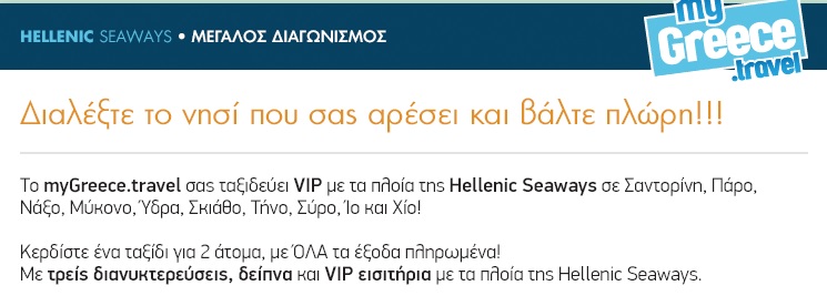 Η σελίδα MyGreece.Travel διοργανώνει διαγωνισμό και σας δίνει τη δυνατότητα να κερδίσετε 9 ταξίδια (δύο ή τριών διανυκτερεύσεων) διαμονής σε επιλεγμένα καταλύματα για 2 άτομα, σε καλοκαιρινούς προορισμούς στην Ελλάδα (Ύδρα, Σκιάθο, Μύκονο, Τήνο, Πάρο, Ίο, Νάξο, Χίο και Σαντορίνη).