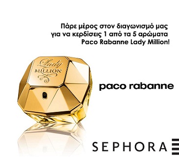 Η σελίδα MySephora διοργανώνει διαγωνισμό και σας δίνει τη δυνατότητα να κερδίσετε 5 αρώματα Lady Million του Οίκου Paco Rabanne.