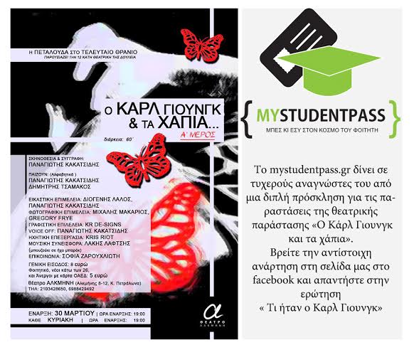 Το mystudentpass.gr δίνει σε τυχερούς αναγνώστες του από μια διπλή πρόσκληση για τις παραστάσεις της θεατρικής παράστασης <<Ο Καρλ Γιουνγκ και τα χάπια>>. Θα δίνεται από μια διπλή πρόσκληση για κάθε παράσταση.