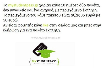 Το mystudentpass.gr χαρίζει κάθε 10 ημέρες δύο πακέτα, ένα αντρικό και ένα γυναικείο, με περιεχόμενο έκπληξη. Αν είστε φοιτητής κάντε like στην σελίδα και μπείτε στην κλήρωση για ένα πακέτο.