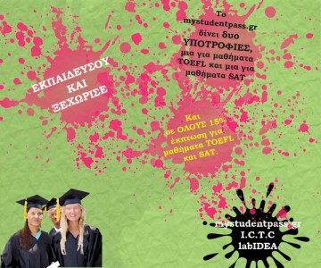 Το mystudentpass.gr αναγνωρίζοντας την αξία των πιστοποιήσεων και την χρηστικότητά τους, δίνει δυο υποτροφίες, μια για μαθήματα TOEFL και μια για μαθήματα SAT. Επιπλέον εξασφάλισε για τους αναγνώστες του, έκπτωση για μαθήματα TOEFL και SAT.