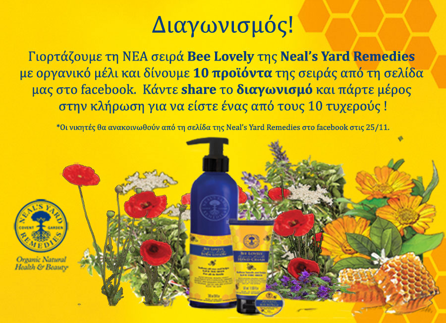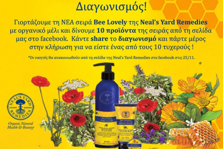Η σελίδα Neal’s Yard Remedies Greece διοργανώνει διαγωνισμό και σας δίνει τη δυνατότητα να κερδίσετε ένα από τα 10 προϊόντα με οργανικό μέλι από τη νέα σειρά περιποίησης BEE LOVELY.