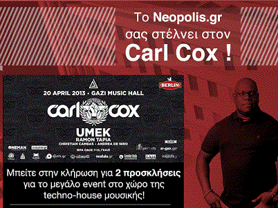Η Neopolis.gr διοργανώνει διαγωνισμό και σας δίνει τη δυνατότητα να κερδίσετε 2 προσκλήσεις για το μεγάλο event στο χώρο της techno-house μουσικής! Ο ανυπέρβλητος CARL COX και ο μοναδικός UMEK θα σας περιμένουν στο Gazi Music Hall (Ιερά Οδός 7-13) στις 20 Απριλίου για το μεγαλύτερο party της χρονιάς που κανείς δεν θα ήθελε να χάσει.