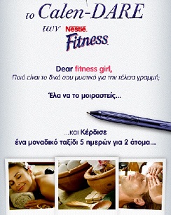 Η σελίδα των Nestlé FITNESS διοργανώνει διαγωνισμό και σας δίνει τη δυνατότητα να κερδίσετε ένα ταξίδι στην Ελλάδα 5 ημερών για 2 άτομα σε ένα πολυτελές spa με πληρωμένες θεραπείες και ένα προσωπικό πρόγραμμα γυμναστικής, σε προορισμό της επιλογής του νικητή, αξίας έως 3.000€.