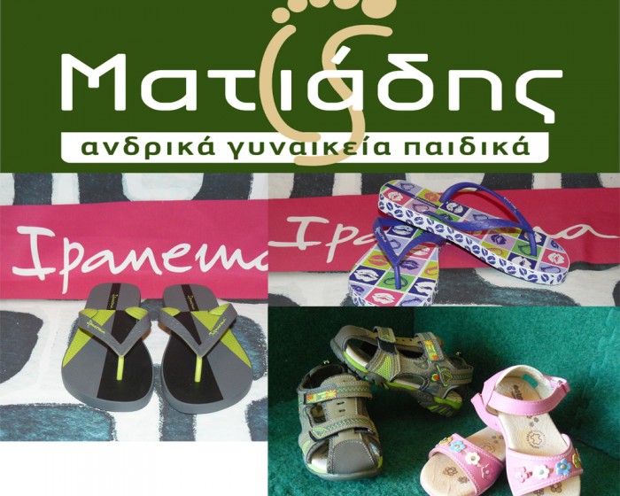 Το κατάστημα Ματιάδης λειτουργεί εδώ και πάνω από 25 χρόνια και διαθέτει μεγάλη ποικιλία σε παιδικά υποδήματα, ανδρικές, γυναικείες και παιδικές παντόφλες, καθώς και ανδρικά και γυναικεία πέδιλα και sneakers/πάνινα. Η εταιρεία μας εκπροσωπεί τις πιο αξιόλογες και γνωστές φίρμες του χώρου, όπως Ipanema, Inblu Sandals, Migato, Sabino, Adam’s Shoes, Beppi, Parex, Disney, Castor κα.